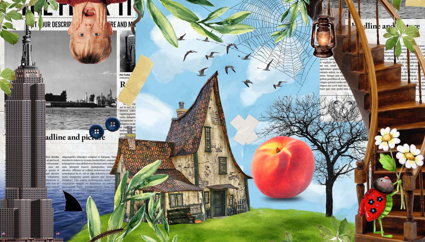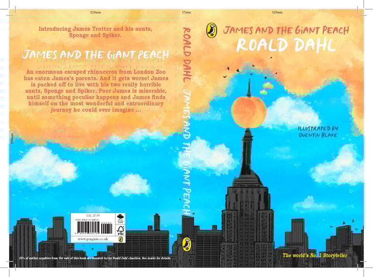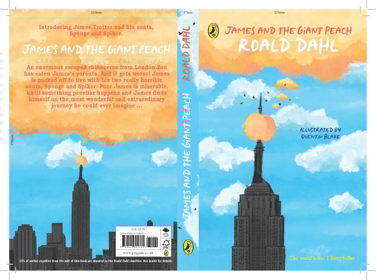 I chose watercolor painting to give the cover a unique feel. The giant peach sits atop the Empire State Building, with warm-toned clouds and cityscape surrounding it. I included references to the bird from the story to tie the design to the book’s magical elements.